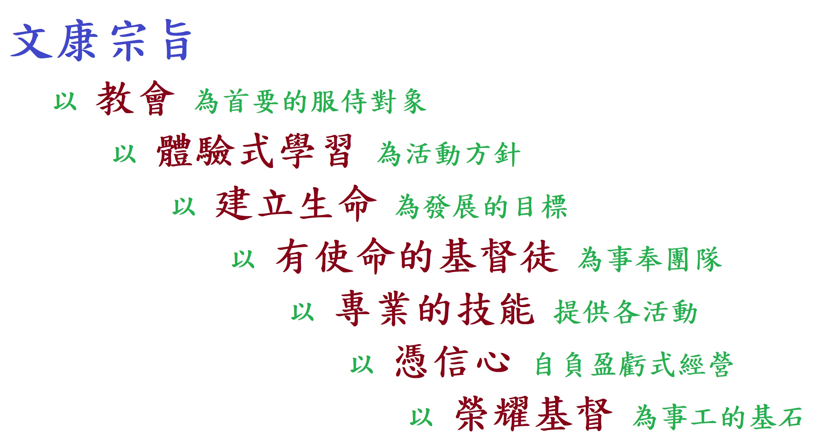 "文康事工"生命教育中心成立於2006年7月4日,由何學成伉儷籌組創辦,是憑信心自負盈虧的基督教福音機構,旨在透過各類型具創意的文化及康樂活動,讓不同階層人士能從常規的生活中,騰出空間重整生命,讓生活更充實和豐盛,從活動中認識創造生命之主。歷年間文康事工主力推動「福音wargame」活動,更自設Wargame專用場地,讓參加者反省生命,認識基督。此外,過去亦曾主領過不少營會、音樂課程、旅行活動、求生活動、佈道聚會及綠化活動等,不斷拓展多元化的福音事工。 時至今日,社會不斷變遷,福音策略亦有所改變,以往我們均以定額收費形式,以提供單項福音活動為主,現在因應教會於疫情過後,福音工作遇到的困難擴大,需要更多方面的支援!我們希望能鼓勵更多信徒為主擺上,多作主工,教會能進入社區,收割 莊稼。 故此,自2020年起,我們憑信心全仰望上帝親自供應,只要是教會主辦的福音活動及事奉者訓練,我們均不設定額服務收費,由教會肢體按感動及能力支持,並免費提供活動器材、資源及福音策略上的建議。除了以住的單項活動,亦增加了連續性的福音小隊計劃,及主動進到人群的社區行動。 相信未來日子將會有更大的挑戰,我們祈望不斷廣大團隊,讓更多有恩賜的肢體,能在文康活動上事奉主,成為合神心意的生命教育團隊,每項福音活動,均與生命結連,讓參加者尋著生命的主,找到人生的盼望。願上帝繼續作工,親自帶動新時代的福音運動 。